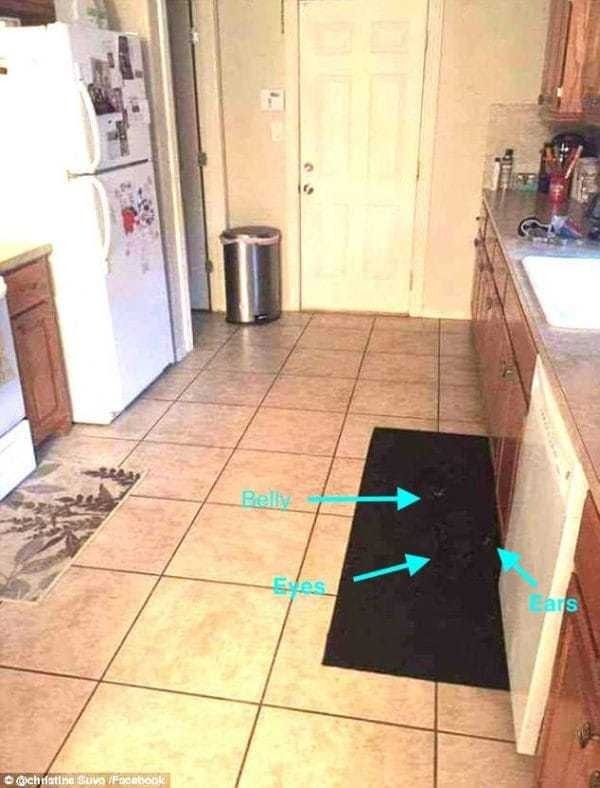 Na sliki pes leži na temni preprogi, in zaradi svojega črnega kožuha ga je izjemno težko opaziti. Le nekaj majhnih podrobnosti ga razkriva.