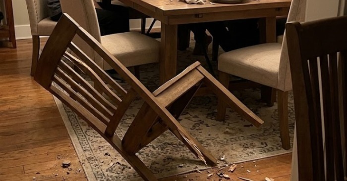 Přesto jsem si sedla. A ve chvíli, kdy jsem přenesla váhu, židle zaskřípěla – a pode mnou se rozpadla, jako by jí někdo podrazil nohy.