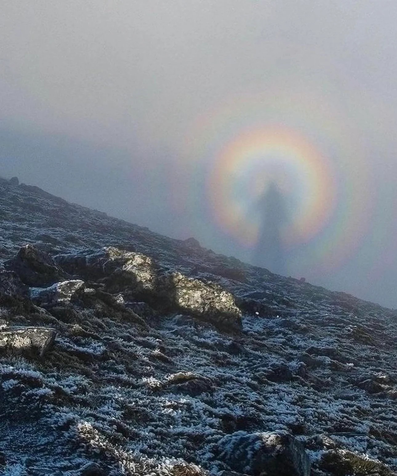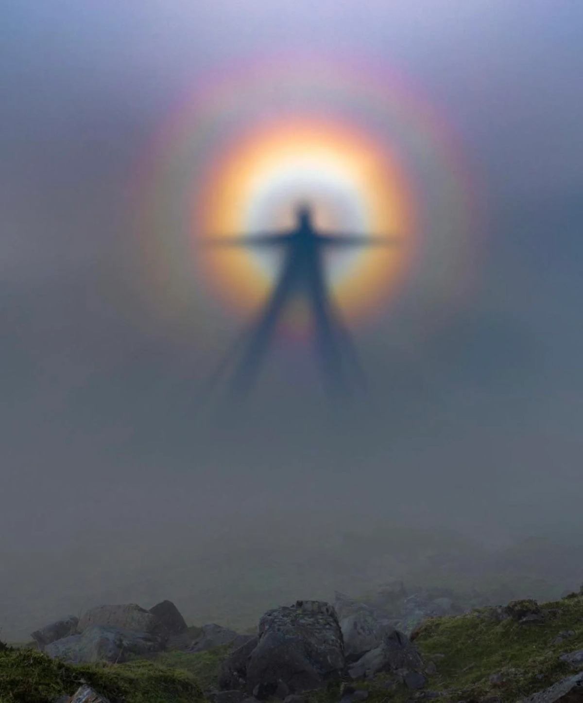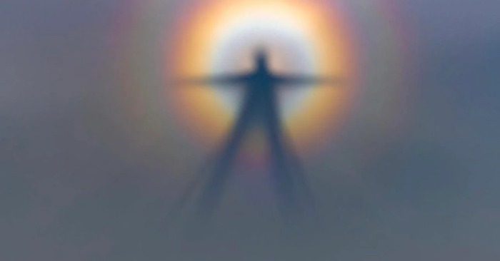 Ljudje pogosto vidijo ogromno senco samega sebe, obdano z žarečimi barvnimi obroči, ki lebdi nad oblaki ali meglo. To lahko deluje srhljivo, če ne veste, kaj se dogaja. Včasih je senca obdana z čudovitim krožnim svetlobnim vzorcem, ki se imenuje glorija.