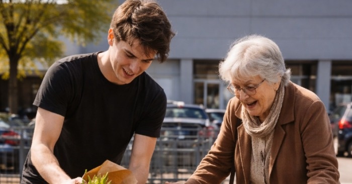 Starejša ženska je počasi hodila po parkirišču supermarketu in previdno potiskala svoj nakupovalni voziček. Imela je le nekaj vrečk, vendar je to zanjo pomenilo celoten teden nakupov. Hodila je zelo počasi, saj so ji noge komaj ubogale in so ji roke zaradi utrujenosti trepetale.
